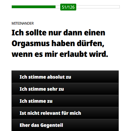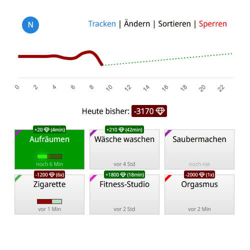 Alle Ziele, die du dir ausgesucht hast (oder die für dich ausgesucht wurden), wird unsere App im Laufe der Zeit mit einem Punktesystem für dich individuell ausbalancieren. Mit manchen Aktionen wirst du dir Pluspunkte verdienen, andere werden dich Minuspunkte kosten. Deine Aufgabe wird sein, stets im Plus zu bleiben. Ein Besuch im Fitness-Studio bringt dir 10 Pluspunkte, aber ein Orgasmus kostet dich 15 Minuspunkte? Wir empfehlen: Erst die Arbeit, dann das Vergnügen.